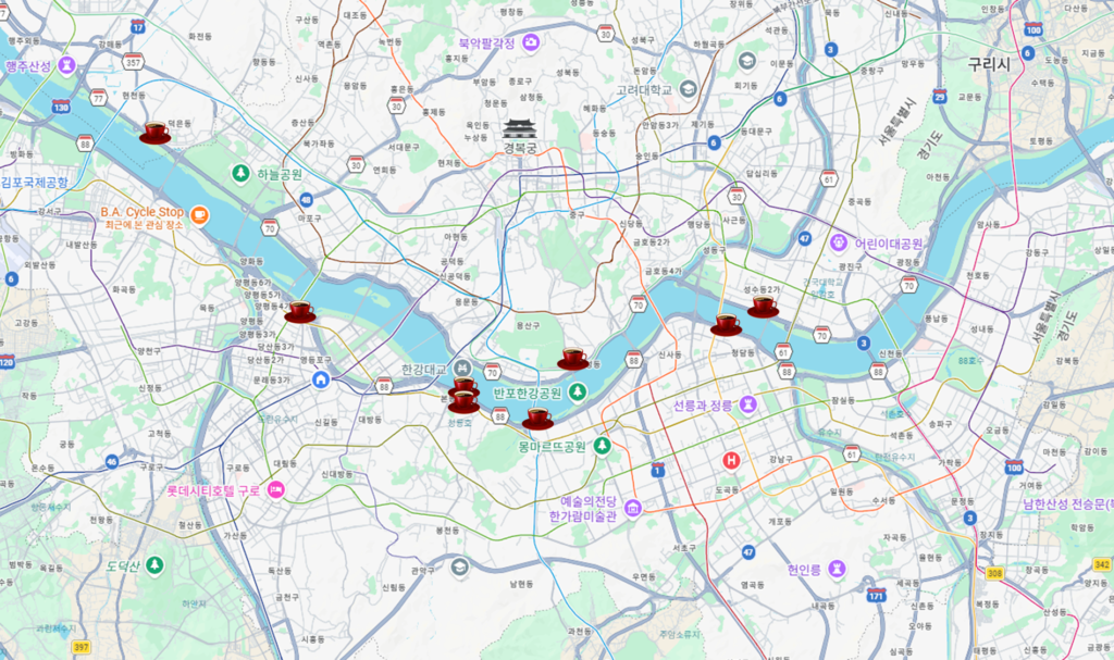 Here are a few cyclist-friendly spots easily accessible from the Han River bike paths, listed from West to East for your convenience.